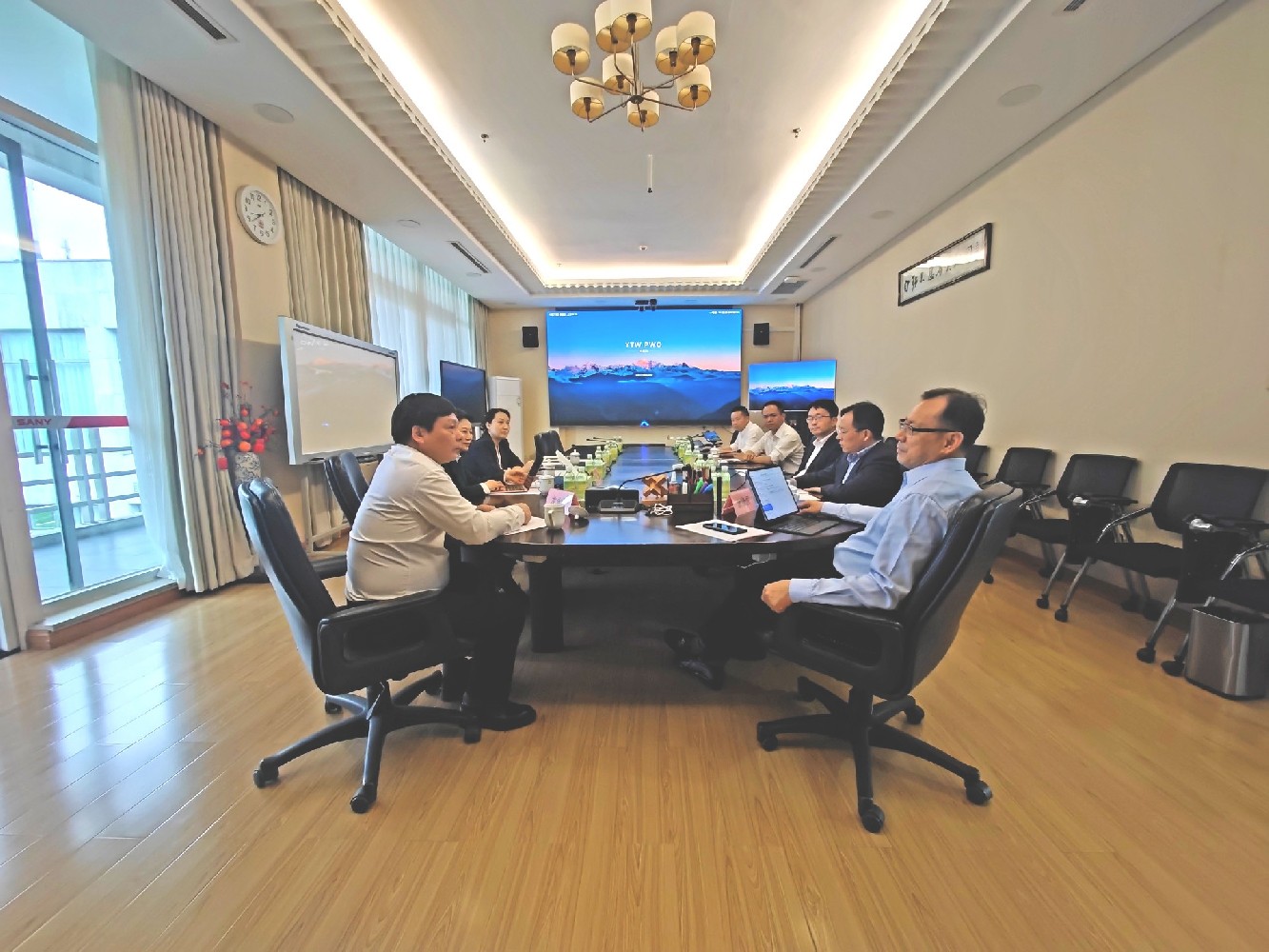 三一集團(tuán)輪值董事長(zhǎng)、總裁唐修國(guó)在三一集團(tuán)長(zhǎng)沙總部與精飛集團(tuán)董事長(zhǎng)龍永堅(jiān)開(kāi)展合作交流